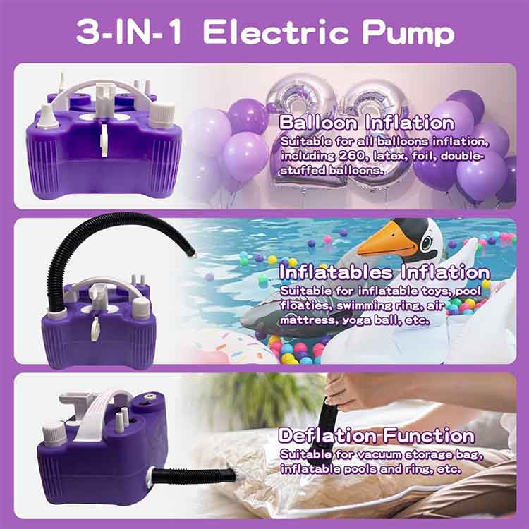 3 از 1 پمپ بالون برقی از فناوری برای ساده کردن زندگی و ایجاد خلاقیت در دسترس استفاده می کند. این که آیا این یک گردهمایی خانوادگی ، جشن تعطیلات ، ماجراجویی در فضای باز یا ذخیره سازی منزل است ، این یک مصنوعات ضروری برای شما است که بتوانید کیفیت زندگی خود را بهبود بخشید! اکنون آن را دریافت کنید و تجربه جدیدی از تورم کارآمد و راحت را شروع کنید!