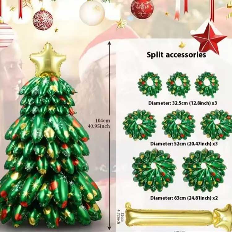 این بادکنک فویلی ایستاده درخت کریسمس در اندازه 130 سانتی متر در 73 سانتی متر است که دو طرح رنگی دارد: درخت سبز کلاسیک و درخت. درخت سبز کلاسیک با فضای کریسمس مطابقت دارد، در حالی که درخت رنگارنگ، به عنوان محصول جدید شرکت ما، برای دکوراسیون منزل، مراکز خرید، بارها، فعالیت های شرکتی مناسب است.