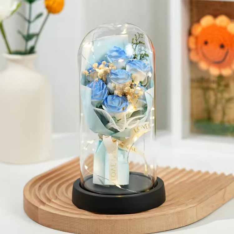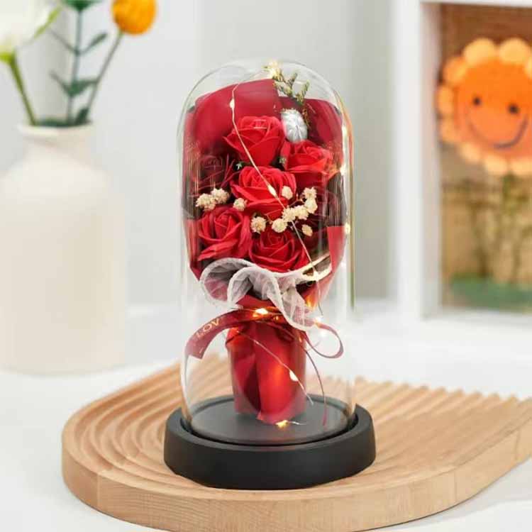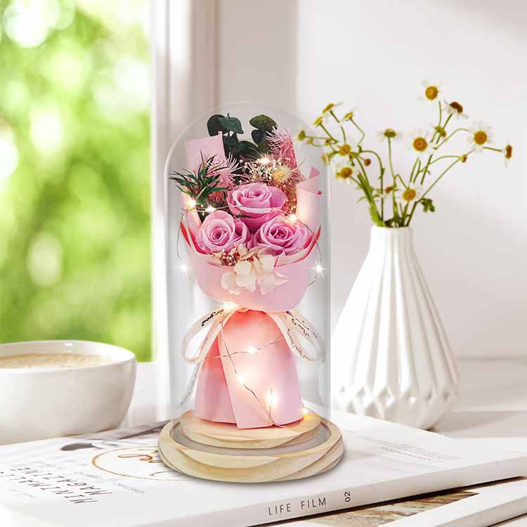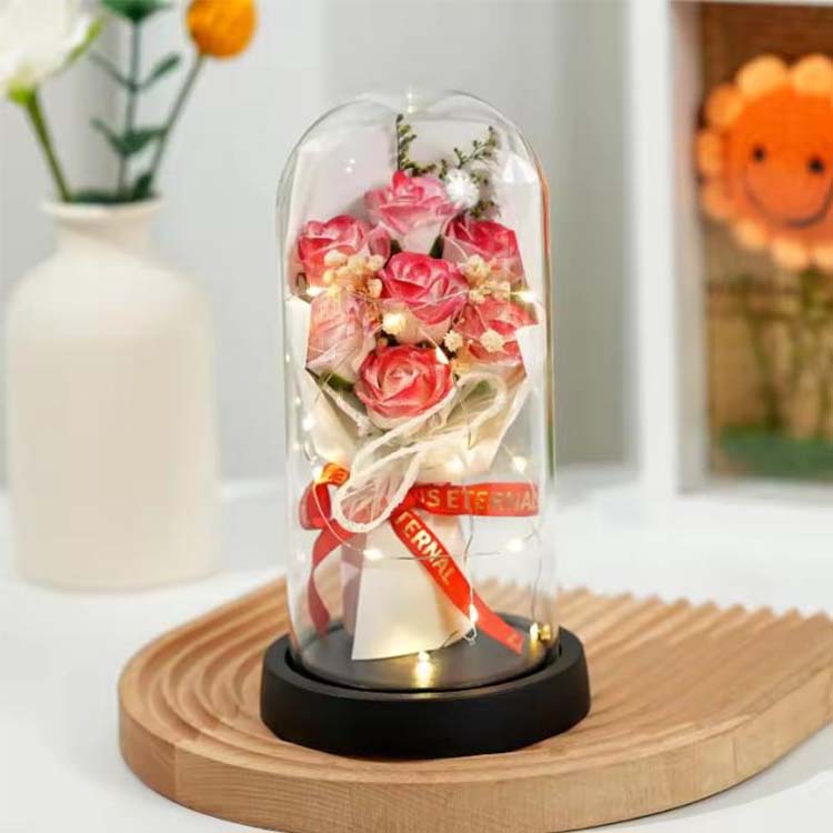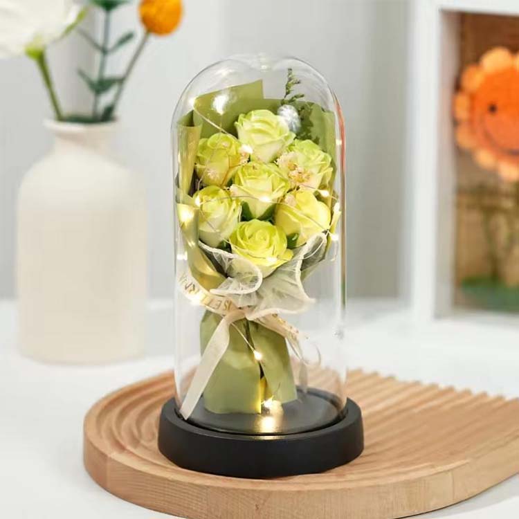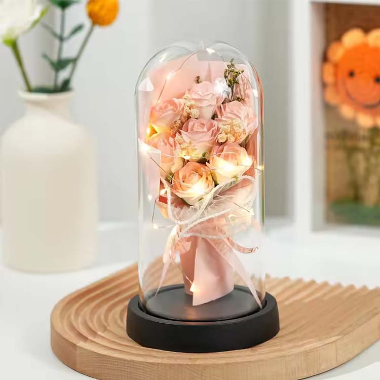 دسته گل رز صابون گنبدی شیشه ای با ال ای دی در ترکیب با گل صابون و گل های نگهداری شده استفاده می شود. چراغ های LED از نور گرم و غیر درخشان استفاده می کنند که می تواند فضایی گرم را در هنگام تزئین صحنه ها ایجاد کند. و غیره، و همچنین می تواند به عنوان یک داده شود هدیه.گلهای جاودانه حتی با روکش شیشه ای پژمرده نمی شوند و تغییر رنگ نمی دهند. از گل های صابون می توان برای شستن دست ها یا به عنوان خوشبو کننده نیز استفاده کرد. این دسته گل رز مقرون به صرفه و کاربردی است.
