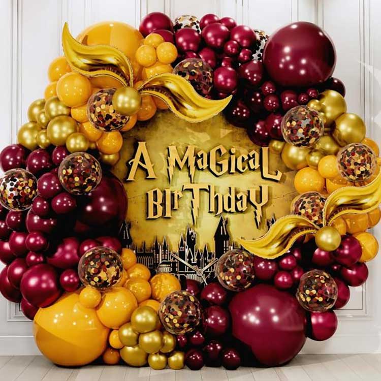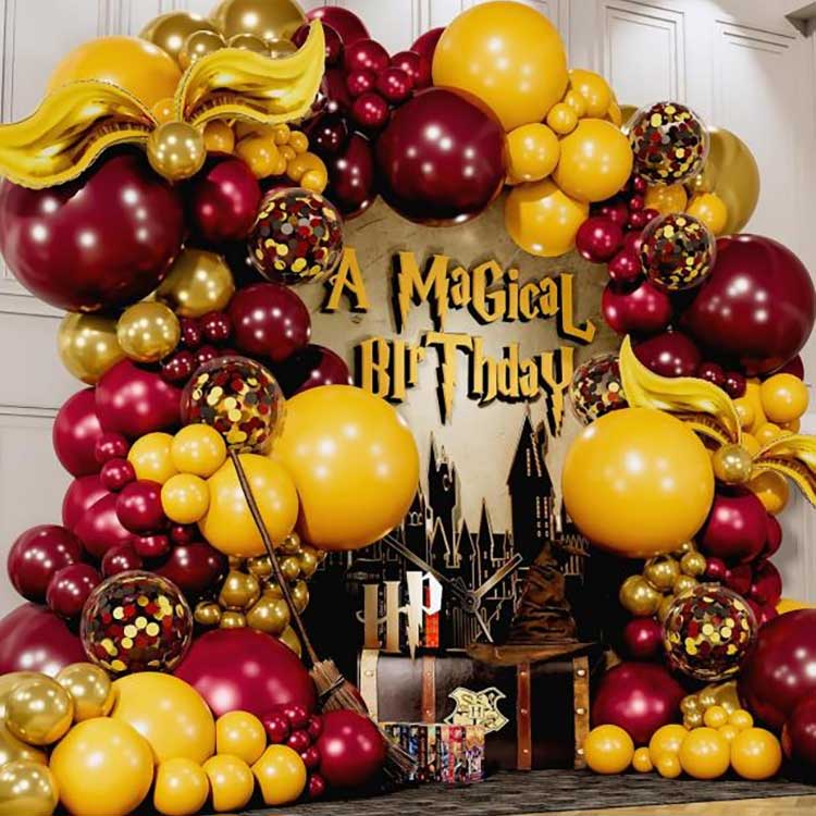 طرح کیت حلقه گل بادکنکی هری پاتر یک گلدسته بادکنکی بزرگ و زیبا می باشد; در این مجموعه تمامی بادکنک های لاتکس از لاتکس طبیعی باکیفیت و خالص با ضخامت و خاصیت کشسانی و کیفیت عالی ساخته شده است. ویژگیهای معمول آن رنگهای روشن و بازتولید وفاداری بالا است، که آن را به یک ویژگی معمولی تبدیل میکند که به همه کسانی که عاشق جادوگران جادو هستند اجازه میدهد احساس کنند که در آنجا هستند. علاوه بر بادکنکهای گرد استاندارد، این مجموعه شامل بادکنکهای فویلی تزئینی شاخ طلایی شکل نیز میشود. پس از باد کردن، میتوان آنها را در هر مکانی مطابق با ترجیح شما قرار داد.