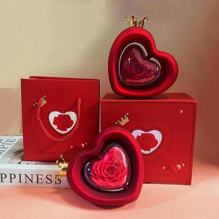 جعبه جواهرات رز شکل قلب از گل های نگهداری شده درجه A استفاده می کند که رنگ و بافت آن از گل های تازه قابل تشخیص نیست.