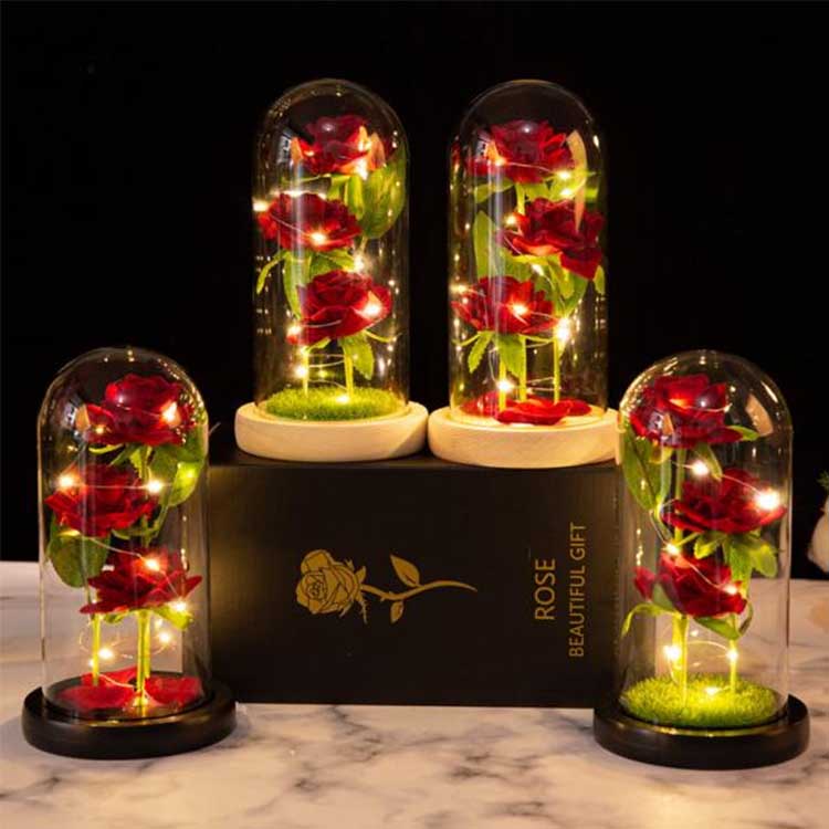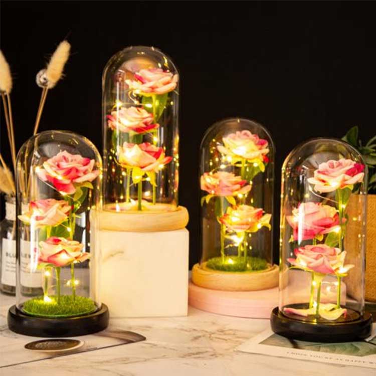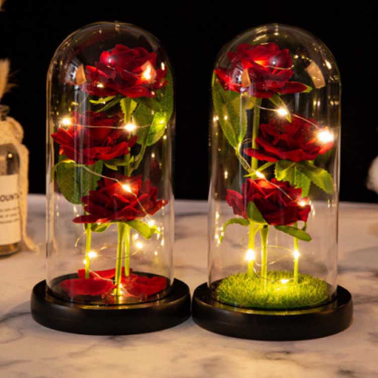 در داخل گنبد شیشه ای رز سه گل حفظ شده در ارتفاعات مختلف قرار گرفته اند، با ساقه های واقعی و برگ های سبز. روکش شیشه ای مقاوم در برابر حرارت است و به راحتی آسیب نمی بیند. چراغ های رشته ای LED دارای نور ملایم داخلی هستند و سوئیچ زیر پایه چوبی برای کارکرد آسان قرار دارد. مناسب برای استفاده در تزیینات عروسی و اثاثیه خانه و همچنین می توان به عنوان هدیه سالگرد و همچنین هدیه ای کوچک برای سالگرد به همراه داشت. کارت هدیه قابل تنظیم
