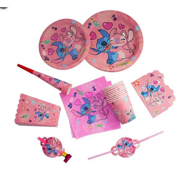 یک ست بشقاب یکبار مصرف Stitch شامل محصولات زیر است: بشقاب های 7 اینچی (10 عدد/کیسه)، بشقاب های 9 اینچی (10 عدد/کیسه)، دستمال سفره (20 عدد/کیسه)، قلم ها (10 عدد/کیسه)، کیسه های هدیه برگشتی (10 عدد/کیسه)، جعبه های پاپ کورن بلوک(6 عدد) (6 عدد/کیسه)، کلاه کاغذی (6 عدد/کیسه)، لیوان کاغذی (10 عدد/کیسه)، شاخ (6 عدد/کیسه)، نی (10 عدد/کیسه)، کارت دعوت (10 عدد/کیسه)، ماسک (10 عدد/کیسه)، قاشق، قاشق، کارد و چنگال/کیسه (10 عدد) این مجموعه شامل 17 نوع محصول مختلف است. مشتریان می توانند کل مجموعه را خریداری کنند یا تنها بخشی از اقلام را برای رفع نیازهای خود انتخاب کنند.